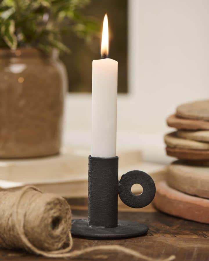 Ib Laursenin Turku kynttilänjalka on tyyliltään ihanan minimalistinen ja samanaikaisesti sopivan rustiikkinen. Sen pelkistetty muotoilu ja musta väri tekevät siitä ajattoman lisän mihin tahansa sisustukseen. Kynttilänjalka sopii täydellisesti kruunukynttilöille, joiden halkaisija on noin 2,2 cm. Tukeva metallinen kynttilänjalka pitää kynttilän hyvin pystyssä. Turku kynttilänjalka luo tunnelmallista valoa arkeen ja juhlaan. Yhdistä tämä minimalistinen malli osaksi kattauksia ja asetelmia. Sopii hyvin yhdistettäväksi esim. posliinisten kynttilänjalkojen kanssa tai korkeiden kynttilänjalkojen rinnalle.